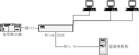 用超級嗅探狗局域網監控軟件實現網絡監控,需要把安裝超級嗅探狗的電腦接到交換機的“鏡像端口”上面。本例將以D-Link3226交換機為例,介紹如何通過D-Link3226交換機來實現局域網網絡監控管理。此例也同樣適用于D-Link的其他支持端口鏡像的交換機。
