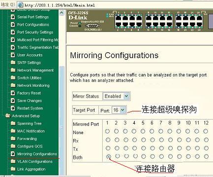 在本例中,直接在D-Link3226上做端口鏡像即可,dlink3226端口鏡像的配置如下圖: