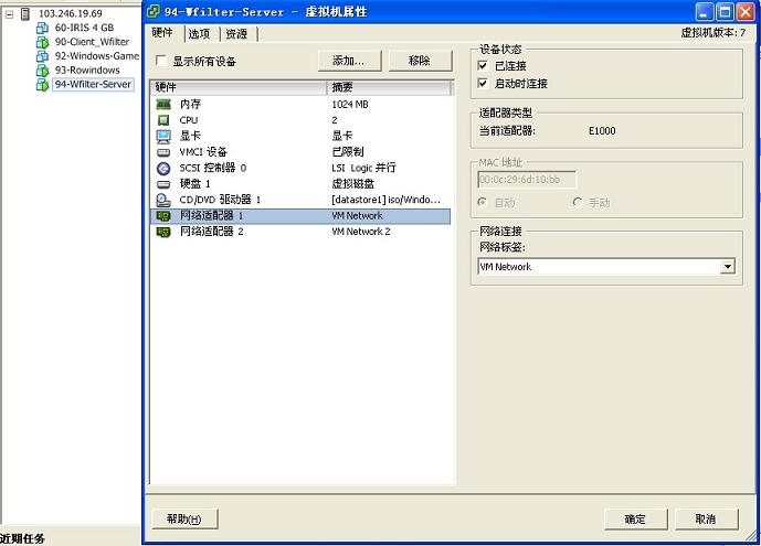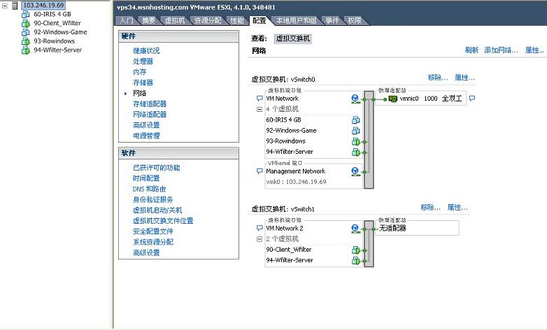 如下圖所示,監(jiān)控虛擬機(jī)“94-wfilter-server”串接在vSwitch0和vSwitch1之間,vSwitch1不連接實(shí)際的適配器。這樣的架構(gòu)下,所有vSwitch1上的虛擬機(jī)的上網(wǎng)行為都將被監(jiān)控虛擬機(jī)“94-wfilter-server”所監(jiān)控和過濾。