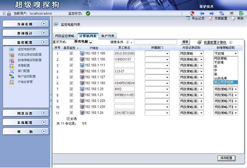 然后,在監(jiān)控配置->監(jiān)控電腦列表中,對需要禁止其訪問視頻網(wǎng)站的電腦使用該封堵策略即可。具體如下圖所示: