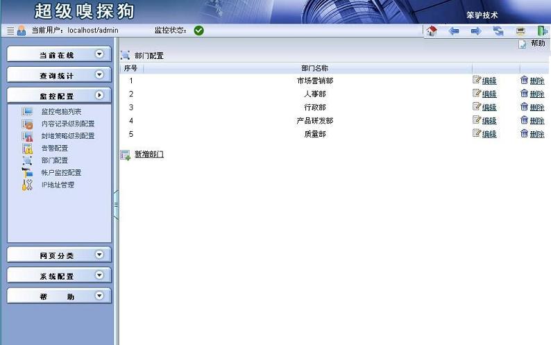 步驟1:點擊監(jiān)控配置->部門配置,進入“部門配置”界面,點擊“新增部門”,即可新增幾個部門。具體如圖所示: