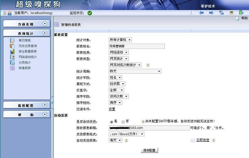 步驟5:點擊查詢統(tǒng)計->標準報表,在“標準報表”界面中點擊“新增標準報表”,進入“新增標準報表”界面,配置好報表基本信息后,可選擇配置接收報表的部門經(jīng)理的郵箱。具體配置如下圖所示: