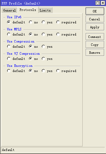 用winbox進(jìn)入ROS,選擇PPP中Profiles,點(diǎn)擊Protocols,去掉壓縮加密后保存并重啟ROS服務(wù)。