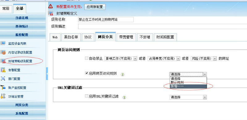 1.選擇監(jiān)控配置->封堵策略級(jí)別配置,單擊“ 新增封堵策略級(jí)別 ”,進(jìn)入“封堵策略級(jí)別配置”界面。輸入名稱(chēng),在網(wǎng)頁(yè)分類(lèi)選項(xiàng)卡新增一個(gè)網(wǎng)頁(yè)訪(fǎng)問(wèn)規(guī)則。具體如下圖所示: