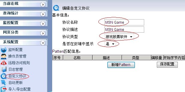 2.1 在“系統配置->自定義協議”中點擊“ 新增自定義協議”增加一個自定義協議,命名為MSN Games,協議類型選擇“游戲股票軟件”,如下圖所示:
