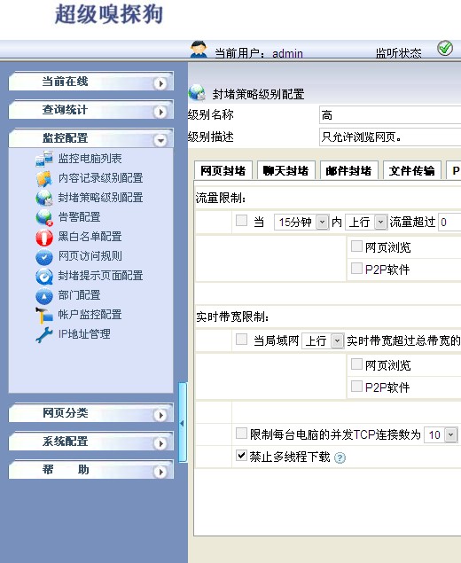 1.首先在超級嗅探狗“封堵策略級別配置”中設置,禁止多線程下載,如下圖所示: