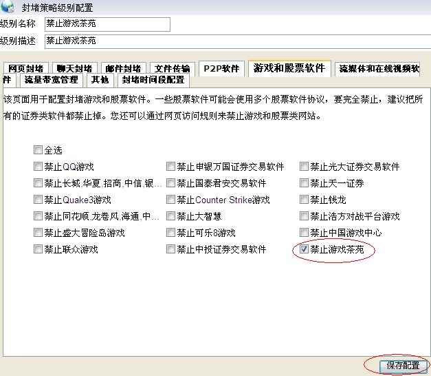 1.3 在“監(jiān)控配置->封堵策略級別配置”點擊“ 新增級別”,級別名稱為禁止游戲茶苑,在“游戲和股票軟件”選項卡中增加了用戶自定義的“禁止游戲茶苑”選項,選中“禁止游戲茶苑”的復選框點擊保存。如下圖所示: