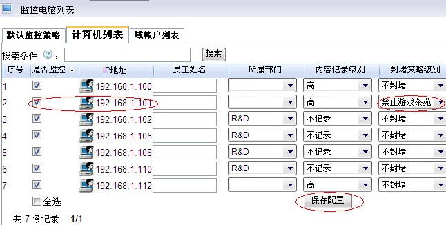 1.4 在“監(jiān)控配置->監(jiān)控電腦列表”里,選中要封堵的主機和封堵策略級別,保存配置并應用封堵策略,如下圖所示: