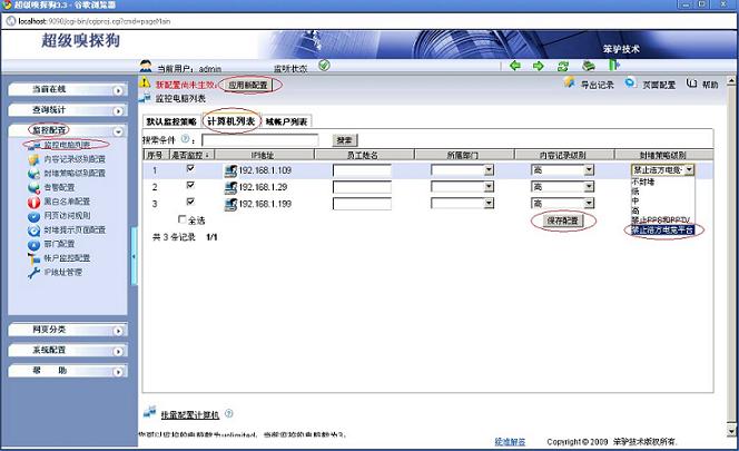 (2)在“監控配置--> 監控電腦列表--> 計算機列表”中應用封堵策略,如下圖所示: