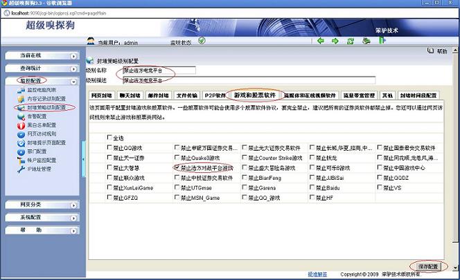 (1)打開超級嗅探狗,在“監控配置-->封堵策略級別配置-->編輯-->禁止浩方電競平臺”,配置如下圖所示
