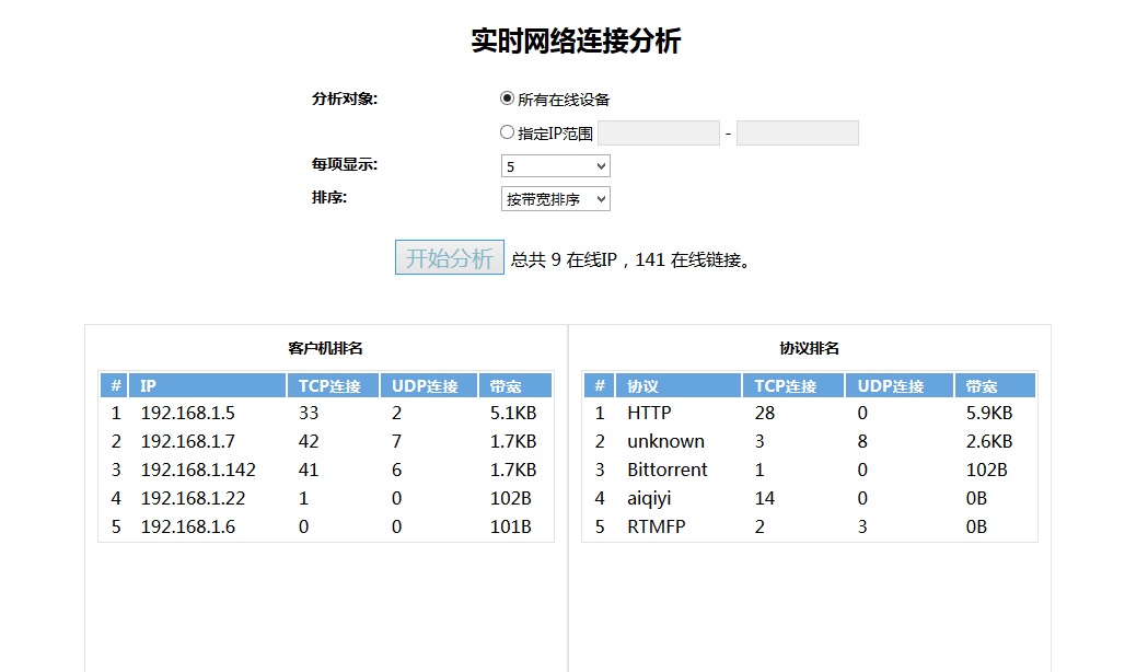 分析在線鏈接的IP、協(xié)議和帶寬分布。 |